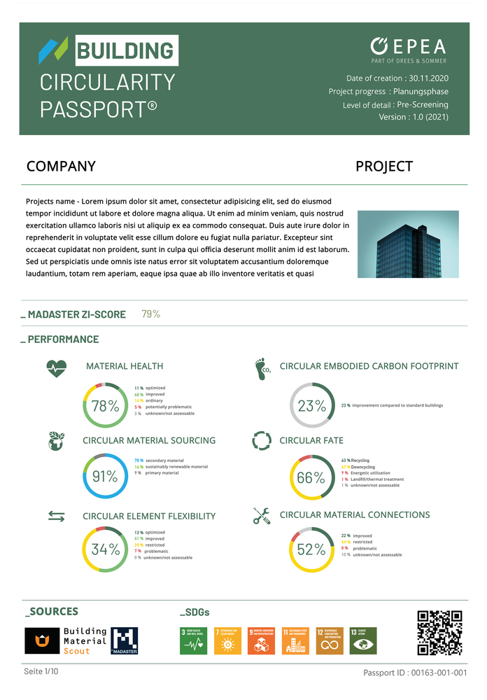 Principally, by depicting all relevant data directly in the BIM model, it was possible to catalog electronically in the building material passport (building circularity passport) the information related to the envisaged materials, and to organize it in relation to the C2C criteria in terms of composition and suitability. This resource passport was developed by EPEA GmbH and Drees & Sommer, and proves to be particularly helpful for the planning and documentation of the project (Fig. 4). Requirements become clearer for everyone involved in the project. With a digital interface, all changes to the building are recorded and updated automatically. So the materials used can be exactly traced, and even years after completion of the building, information on what was installed when and in which position is still comprehensible.