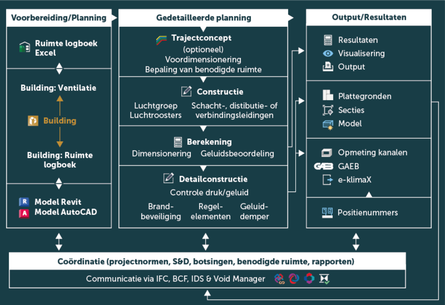 We beginnen in een vroege planningsfase, wanneer er nog geen gebouwmodel beschikbaar is, en gaan dan verder met de overgang naar modelgebaseerde planning, de modelmeting voor gedetailleerde planning en het indienen van een dossier voor de productie van de kanaalcomponenten.