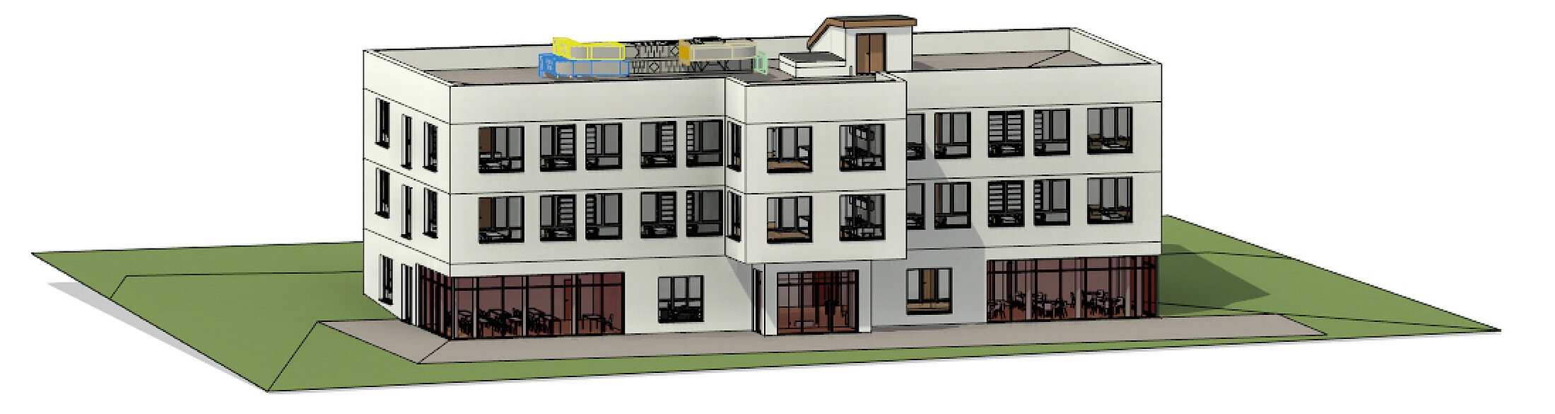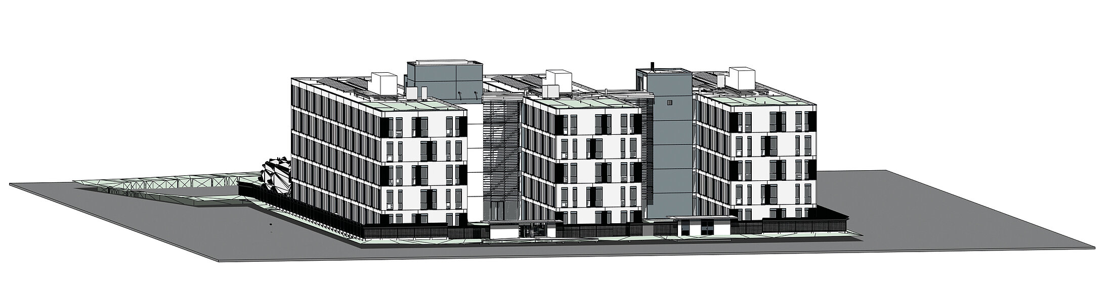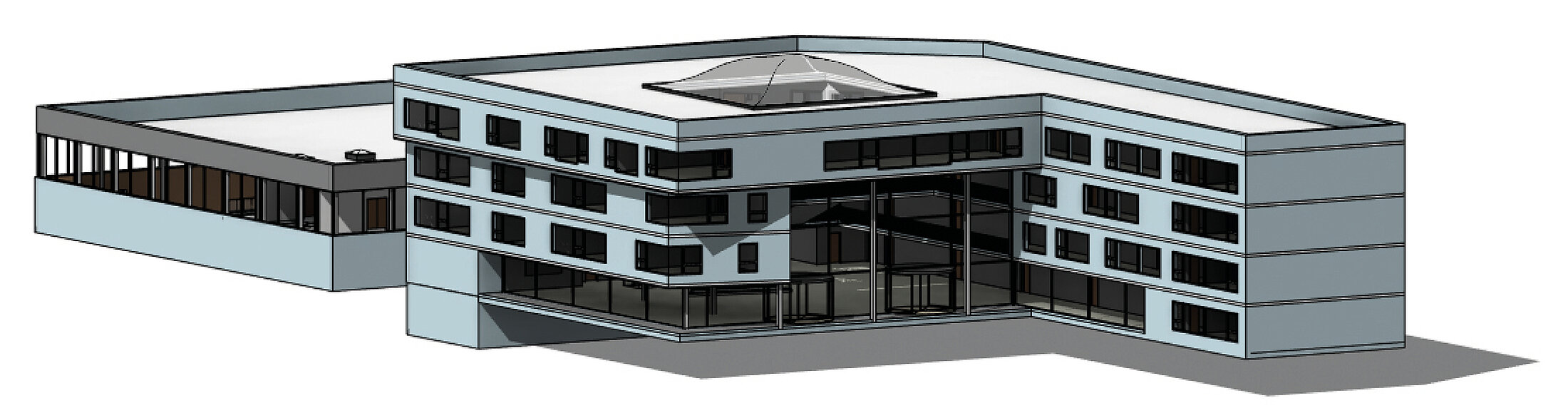 Het grootste model dat hier wordt bekeken (aangeduid als "Kantoor L") is een kantoorgebouw met een netto vloeroppervlak van ongeveer 11.000 m², verdeeld over drie vleugels met een hoge mate van zelfbeschaduwing op de binnengevels van elke vleugel. Het gebouwmodel wordt geleverd als een IFC-link. Op de locatie van het gebouw worden de buitengevels beschaduwd door omliggende gebouwen, die kunnen worden gemodelleerd met solids. Voor deze benchmark zijn extra omringende geometrieën weggelaten, omdat ze slechts marginale veranderingen in de rekentijden zouden veroorzaken. Dit voorbeeld laat zien dat het extraheren van de geometrie van het model ongeveer zes minuten verwerkingstijd vergt, waardoor het aanzienlijk veeleisender is. Dit komt zowel door het hoge niveau van geometrische details als door de onderliggende IFC-gebaseerde modellering, die meer rekeninspanning vereist in vergelijking met Revit-native architecturen. De berekening van de ontwerpdagen blijft echter binnen een praktisch bereik van iets minder dan zeven minuten, zelfs in deze configuratie. Berekeningen voor een heel jaar kunnen indien nodig gemakkelijk tijdens een lunchpauze worden uitgevoerd.