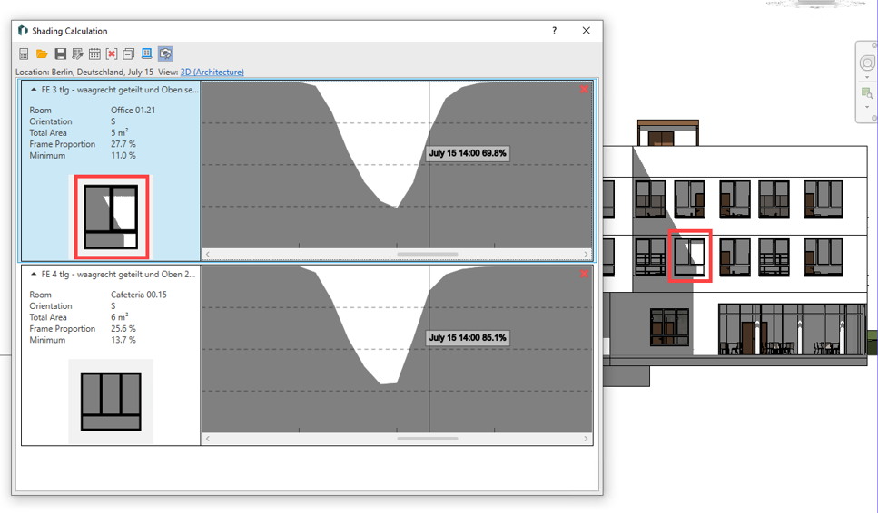 De berekeningsperiode kan optioneel worden beperkt tot de relevante ontwerpdagen volgens VDI 2078 in plaats van een heel jaar te beslaan. Als er onaannemelijkheden worden gedetecteerd (bijv. door een verkeerd ingestelde projectlocatie of onjuiste positionering/oriëntatie van componenten), kan de inhoud van het model direct worden gecorrigeerd en kan de schaduwdataset voor het model opnieuw worden berekend.