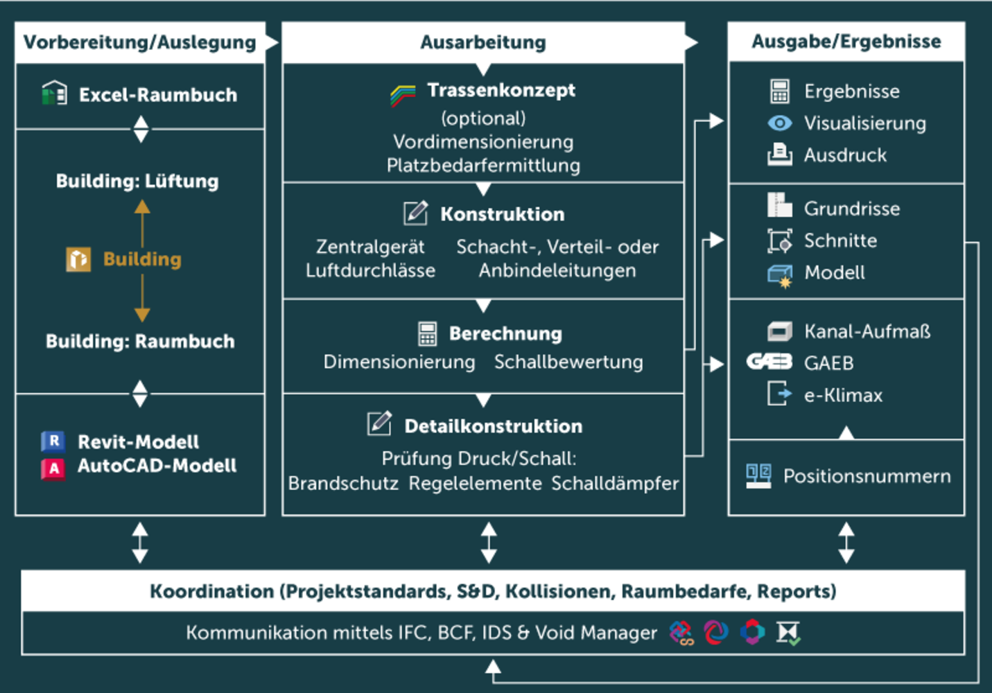Innym formatem wyjściowym specyficznym dla wentylacji jest format e-klimaX, który zawiera dane produkcyjne dla kanałów powietrznych i może być przetwarzany przez większość firm zajmujących się budową kanałów. W wielu przypadkach jest on nawet "podawany" w pełni automatycznie do maszyn produkcyjnych. Działa to jednak dobrze tylko w przypadku standardowych elementów kanałów. Specjalne części formowane, na przykład dla szczególnie wąskich, trudnych lub zoptymalizowanych pod kątem przepływu sytuacji, nadal muszą być dostarczane do firmy budującej kanały ręcznie wraz ze zwymiarowanymi szczegółowymi rysunkami. Ponieważ wysiłek ten rzadko jest proporcjonalny do korzyści i kosztów, oto apel do projektantów wentylacji: Unikaj specjalnych elementów formowanych, nawet jeśli czasami są one wygodniejsze w planowaniu. W wielu sytuacjach optymalizacja przepływu może być osiągnięta wystarczająco dobrze dzięki kombinacji kształtek (słowo kluczowe: rama kombinowana).