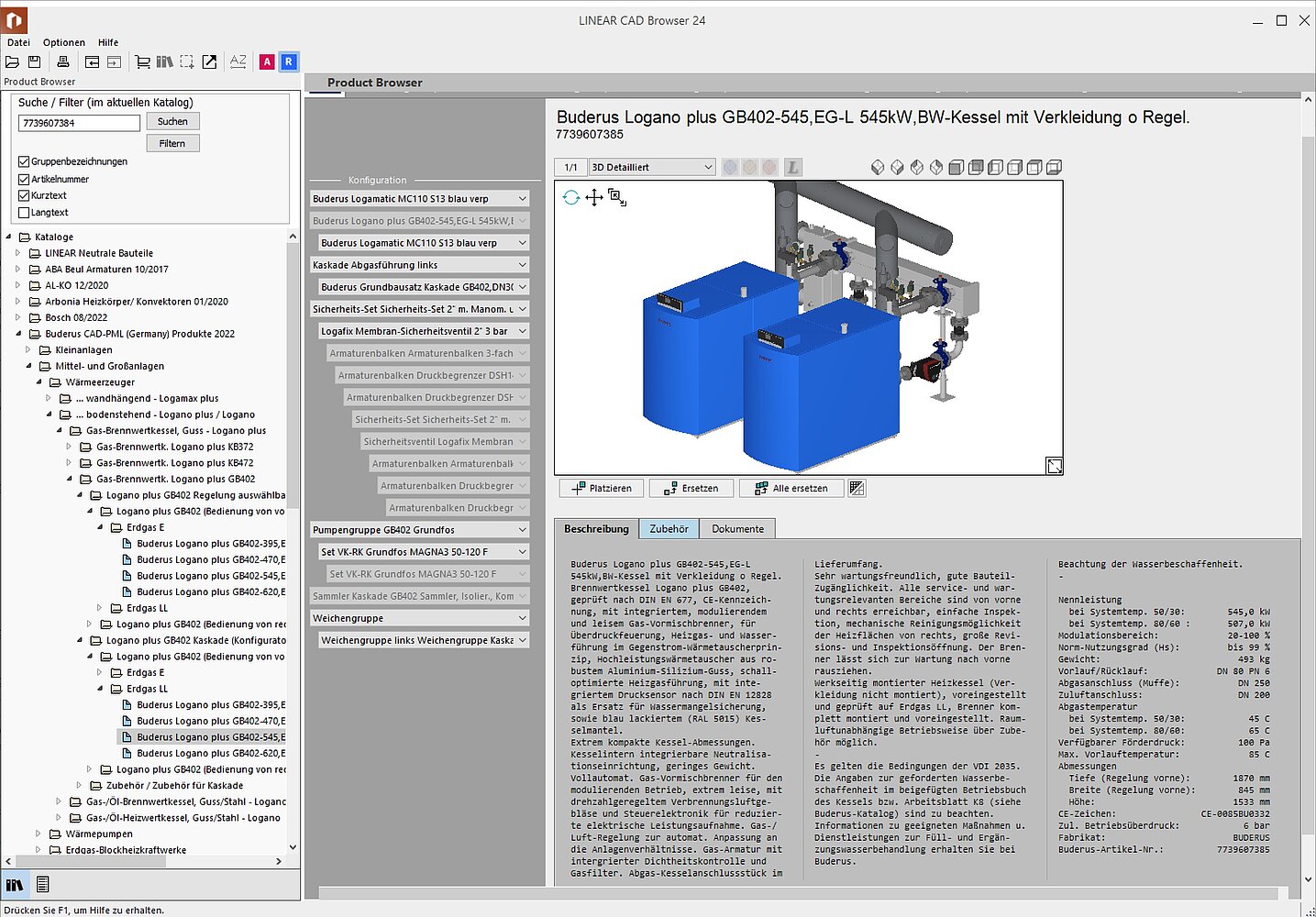 Przeglądarka CAD jako aplikacja desktopowa Użytkownicy LINEAR otrzymują przeglądarkę CAD do korzystania z szerokiej gamy katalogów producentów. Ułatwia to nawigację po katalogach. Alternatywnie, zintegrowane wyszukiwanie pełnotekstowe pomaga szybko znaleźć pożądane produkty lub kompletne zespoły.