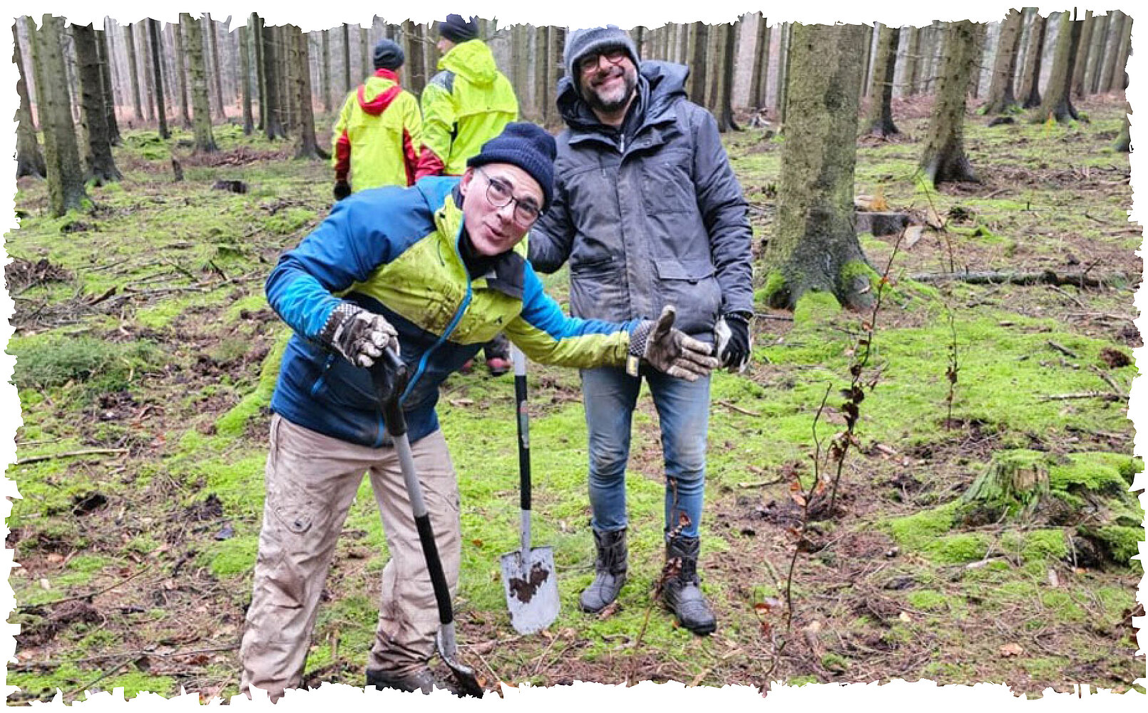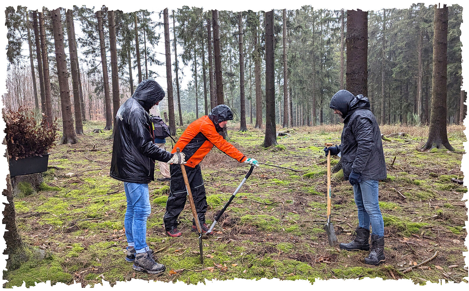 Po dwóch godzinach zrobiliśmy sobie przerwę. Wzmocniliśmy się gorącymi napojami, które przywieźliśmy ze sobą i pysznymi smakołykami z piekarni, ogrzaliśmy się trochę przy ognisku i pozwoliliśmy naszym przemoczonym warstwom ubrań trochę wyschnąć. Pomimo wysiłku fizycznego, zimno i deszcz były wszechobecne. Następnie rozpoczęliśmy ostatni zryw i zasadziliśmy pozostałe sadzonki w ciągu pozostałych dwóch godzin. W międzyczasie deszcz nawet ustąpił, co sprawiło, że kopanie stało się nieco przyjemniejsze.