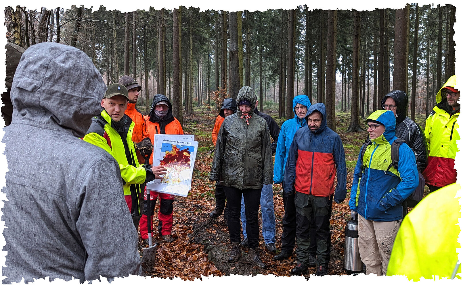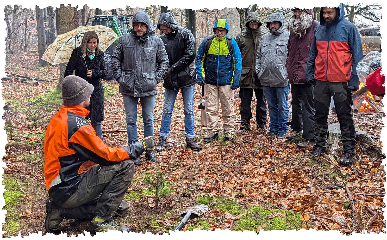 Po krótkim powitaniu przy rozpalonym wcześniej ognisku, pan Wiesmeyer dał nam odkrywczy wgląd w obecny stan niemieckich lasów. Może nie jest to oczywiste na pierwszy rzut oka, ale ostatnie kilka lat charakteryzowało się ekstremalną suszą, która zdestabilizowała gleby leśne. W rezultacie wiele drzew nie jest już bezpiecznych i może zostać łatwo wyrwanych z korzeniami podczas coraz silniejszych burz. Według raportu rządu federalnego na temat stanu lasów, niemieckie lasy są w gorszym stanie niż kiedykolwiek wcześniej. Trzy na cztery drzewa mają rzadkie korony - oznakę problemów zdrowotnych, dlatego też urząd leśnictwa ciężko pracuje nad ponownym zalesieniem naszych lasów gatunkami drzew odpornymi na klimat.