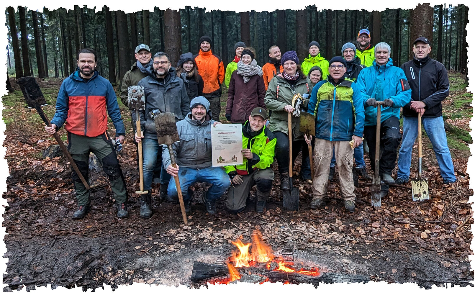 16:00 - cztery godziny spędzone w lesie za nami i sadzenie dobiegało końca. Po raz ostatni zebraliśmy się przy ognisku, gdzie pan Wiesmeyer uroczyście wręczył nam certyfikat sponsora lasu dla naszego lasu firmowego. Z serdecznymi podziękowaniami dla zespołu biura leśnego, pożegnaliśmy się, wróciliśmy na parking, gdzie czekał na nas autobus i wyruszyliśmy w podróż powrotną do Aachen.