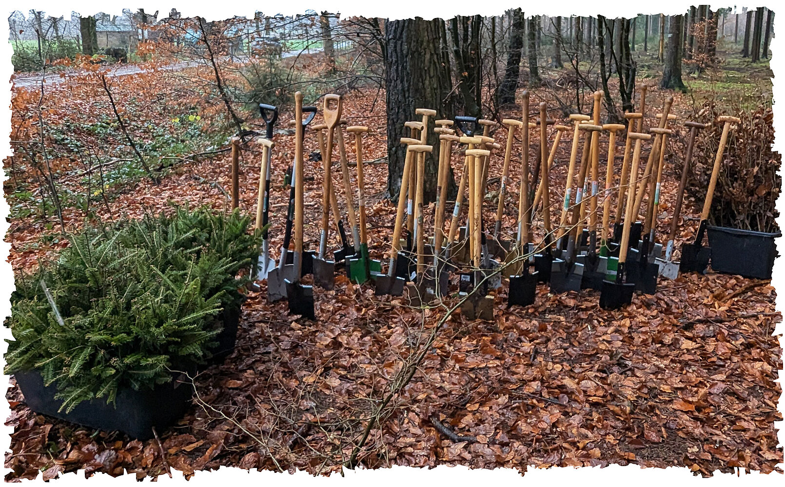 Zebraliśmy się punktualnie o godzinie 11.00 przed budynkiem naszej firmy w Akwizgranie. Wspólnie udaliśmy się wynajętym autobusem w kierunku Hürtgenwald, zalesionego obszaru w północnej części Eifel na granicy Niemiec i Belgii, w okręgu Düren (Nadrenia Północna-Westfalia). Po 50 minutach jazdy dotarliśmy na parking Asterbach, wcześniej uzgodnione miejsce spotkania. Tam powitał nas pan Wiesmeyer, szef państwowego leśnictwa w regionalnym biurze leśnictwa Rureifel-Jülicher Börde. Zaprowadził nas do oddalonego o około kilometr fragmentu lasu, gdzie czekał już na nas jego zespół.
