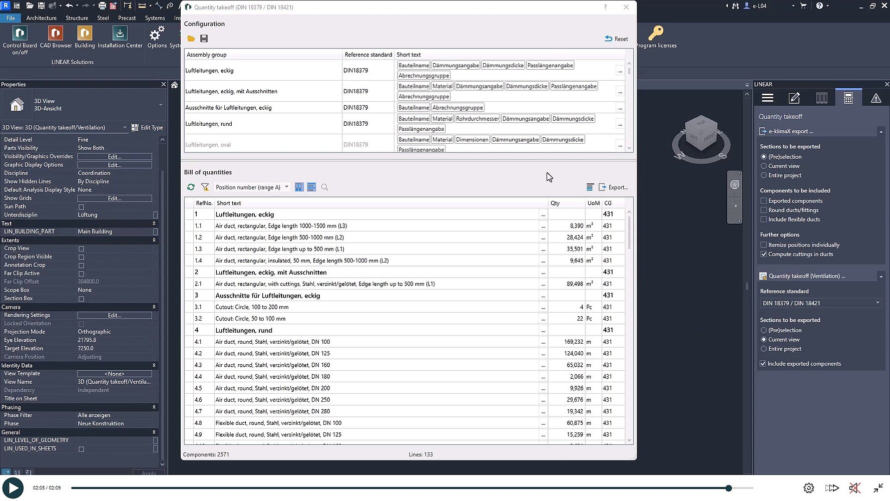 Na podstawie zwymiarowanej sieci wentylacyjnej wszystkie komponenty można sklasyfikować według grup kosztów. W razie potrzeby program może automatycznie sugerować klasyfikacje zgodnie z różnymi normami. To samo dotyczy klasyfikacji IFC, którą można przeprowadzić w tym samym kroku.
