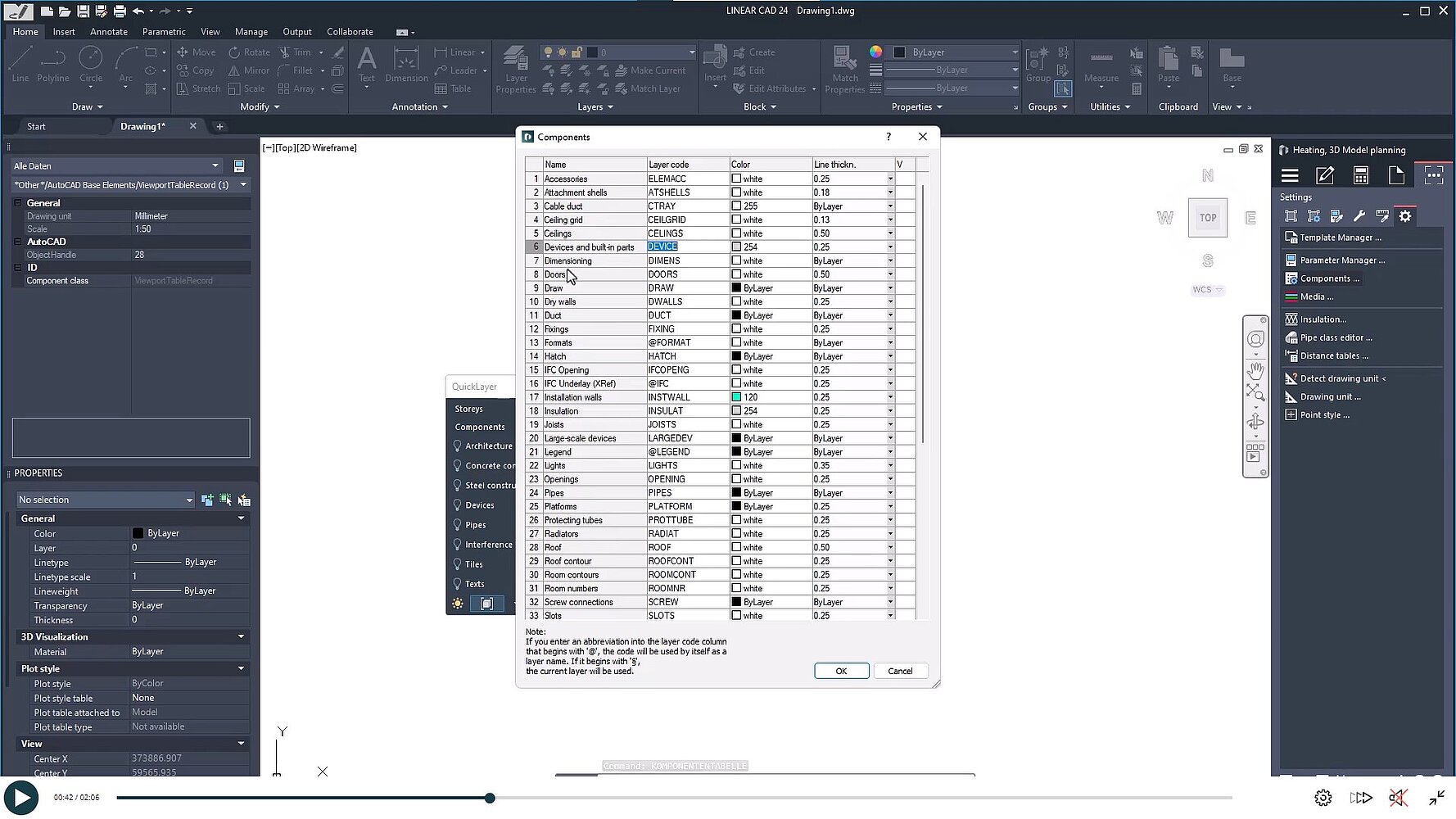Komponenty są zorganizowane w ponad 50 różnych warstw, z tekstami, ścianami i wielodyscyplinarnymi symbolami przypisanymi do oddzielnych warstw. Tabela może być używana do ukrywania i pokazywania poszczególnych komponentów.
