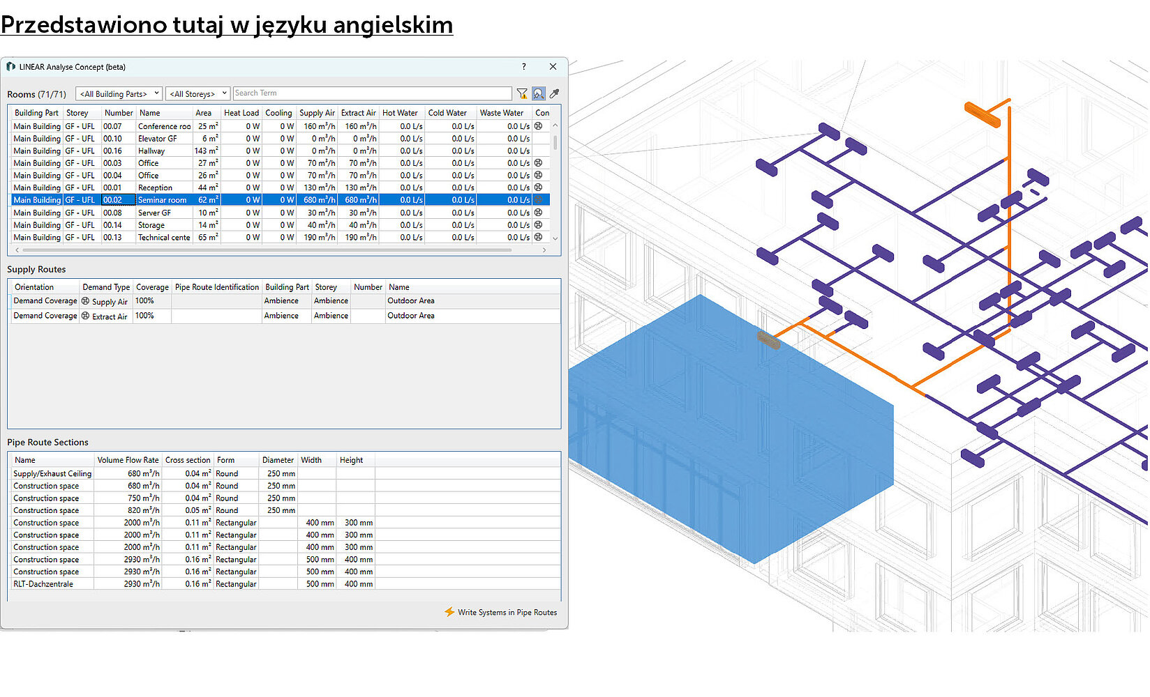 Koncepcja trasowania rur LINEAR została znacznie ulepszona dzięki nowemu asystentowi wymiarowania. Dzięki prostym procedurom możliwe jest wymiarowanie nawet rozległych sieci obejmujących wiele systemów w oparciu o wymagania przestrzenne oraz szybkie analizowanie wariantów. Przedstawione narzędzia są dostępne dla wszystkich klientów od wersji 26.0 w ramach wersji beta bez dodatkowych kosztów licencyjnych. Znaczące ulepszenia w zakresie zmiany wymiarów, tj. automatycznej zmiany rozmiaru brył tras rurociągów i późniejszego tworzenia rur, zostaną wdrożone przed ostateczną premierą. Jesteśmy przekonani, że to rozwiązanie może w przyszłości stać się ważnym elementem koordynacji przestrzeni konstrukcyjnych MEP we wczesnych fazach projektu. Zachęcamy do rozpoczęcia pracy z tą funkcją już teraz i do skontaktowania się z nami. Wspólnie z Państwem chcemy przenieść projektowanie MEP na wyższy poziom.