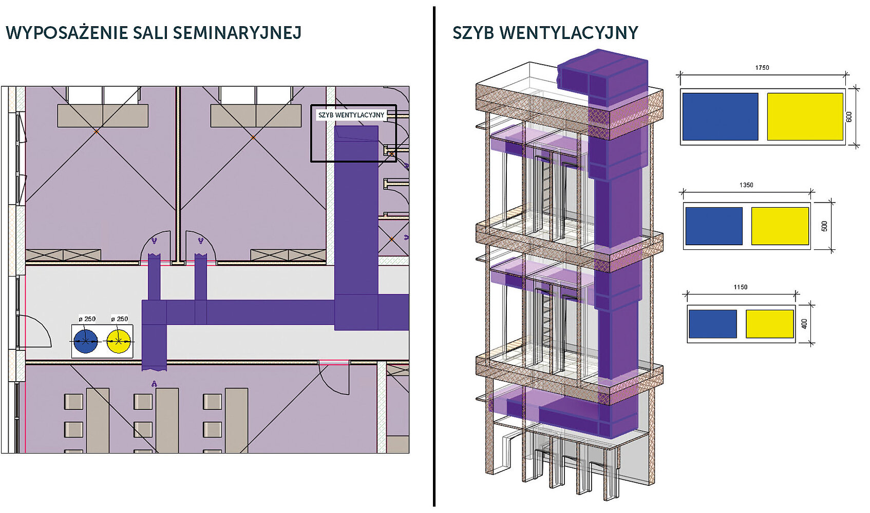 Po wzbogaceniu tras rurociągów można zdefiniować parametryczne układy przekrojów. W tym przykładzie zastosowano jednolity przekrój (powietrze nawiewane obok powietrza wywiewanego), zachowując indywidualnie określone wymiary dla całego budynku. Dzięki połączeniu wymiarów z planami przekrojów można teraz zmienić wymiary brył tras rurociągów i wyeksportować je jako przeszkody, np. za pośrednictwem ścieżki IFC, dla osób odpowiedzialnych za budynek. Narzędzia LINEAR można jednak wykorzystać również do stworzenia dokumentacji informacyjnej dotyczącej najważniejszych etapów projektu. Na początku kolejnej fazy projektu można użyć funkcji generowania rur i kanałów, aby stworzyć wstępną sieć rurociągów do dalszego dopracowania.