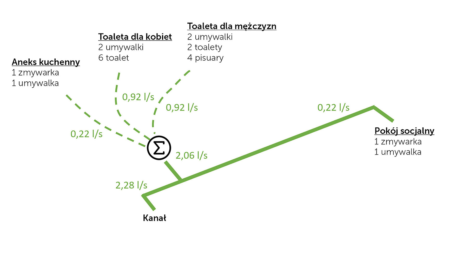 Na końcach sieci można obecnie wykorzystać dane liczbowe do określenia urządzeń, które należy uwzględnić w poszczególnych pomieszczeniach, ustalając w ten sposób wymagany całkowity przepływ na końcach sieci. Łącząc te informacje z podejściem opartym na współwystępowaniu dla danego typu budynku, można w prosty sposób określić przepływy szczytowe. Łącząc to z prędkością maksymalną, można również w prosty sposób określić średnice nominalne odcinków rur.