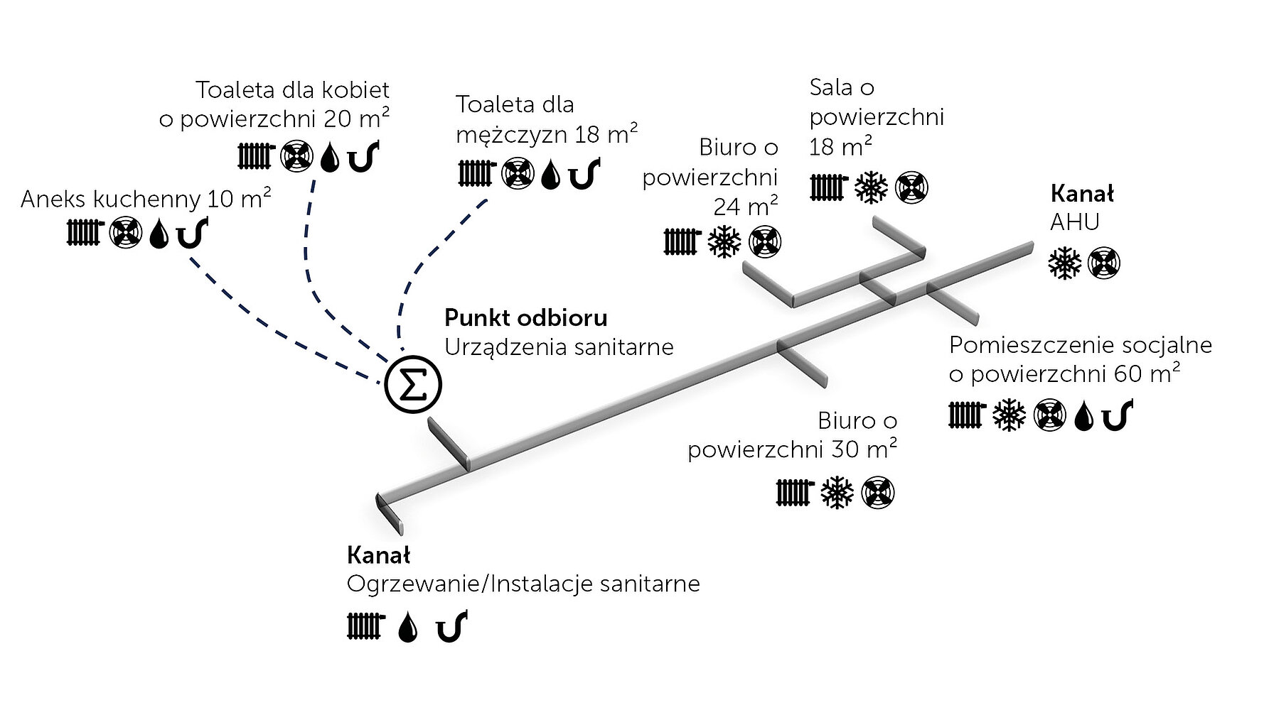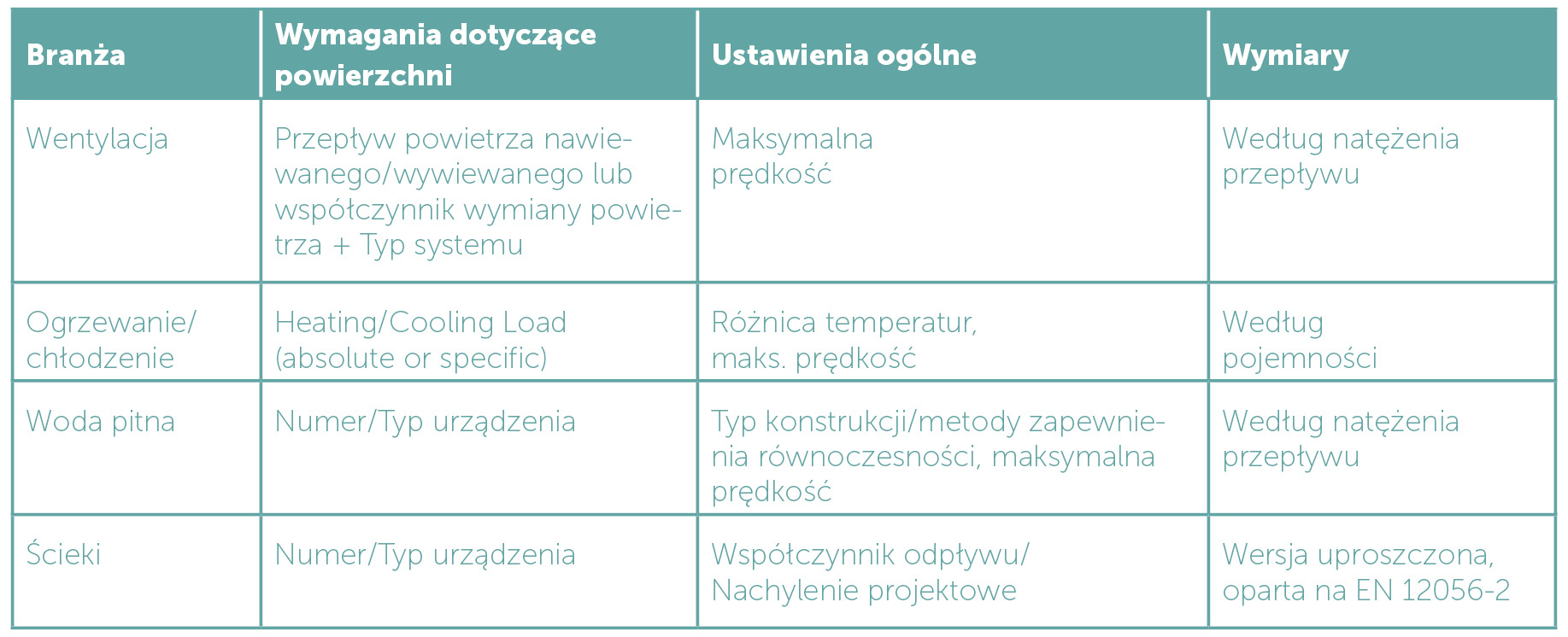W ten sam sposób można traktować systemy ogrzewania i chłodzenia, przy czym sumowane są nie natężenia przepływu, lecz moce. Można je przeliczyć na natężenia objętościowe poprzez określenie różnicy temperatur w systemie oraz na średnice nominalne przy ograniczonej prędkości. Wymagania dotyczące pomieszczeń określa się tutaj zazwyczaj poprzez określenie obciążeń związanych z powierzchnią. Jeśli dostępne jest już szczegółowe obciążenie grzewcze/chłodnicze, wyniki te można oczywiście wykorzystać. Objętości powietrza określone w koncepcji wentylacyjnej można również zastosować bezpośrednio do wymiarowania wentylacji. Alternatywnie, jeśli koncepcja wentylacyjna nie jest jeszcze dostępna, brakujące informacje do wstępnego wymiarowania można uzyskać na podstawie typu systemu w pomieszczeniu (powietrze nawiewane/wywiewane) oraz orientacyjnej wartości wymiany powietrza na podstawie kubatury pomieszczenia.