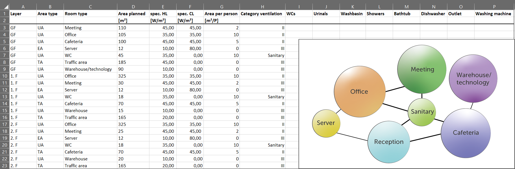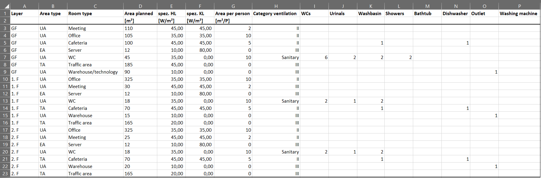 In order to clarify individual steps of the MEP design in early phases, we will explain them once explicitly with an example*. We consider a small office building that is to be equipped with 50 work places. Several meeting rooms, a cafeteria and, on the upper floors, a lounge area with a kitchenette are to be provided. Based on the initial requirements of the building owner and the basic conditions under building law, an initial tabular requirements plan is drawn up. A building window of approx. 40 m x 20 m with a three-story construction method can be realized for the planned property. Based on these basic conditions, functional areas for office, meeting, WC facilities, storage/technology, and traffic areas are defined. The space requirement for each type of functional area is determined for each floor. Furthermore, specific loads for heating and cooling, basic air quality requirements, occupancy density of individuals, and the number of sanitary taps can already be specified in this phase (see Figure 3).