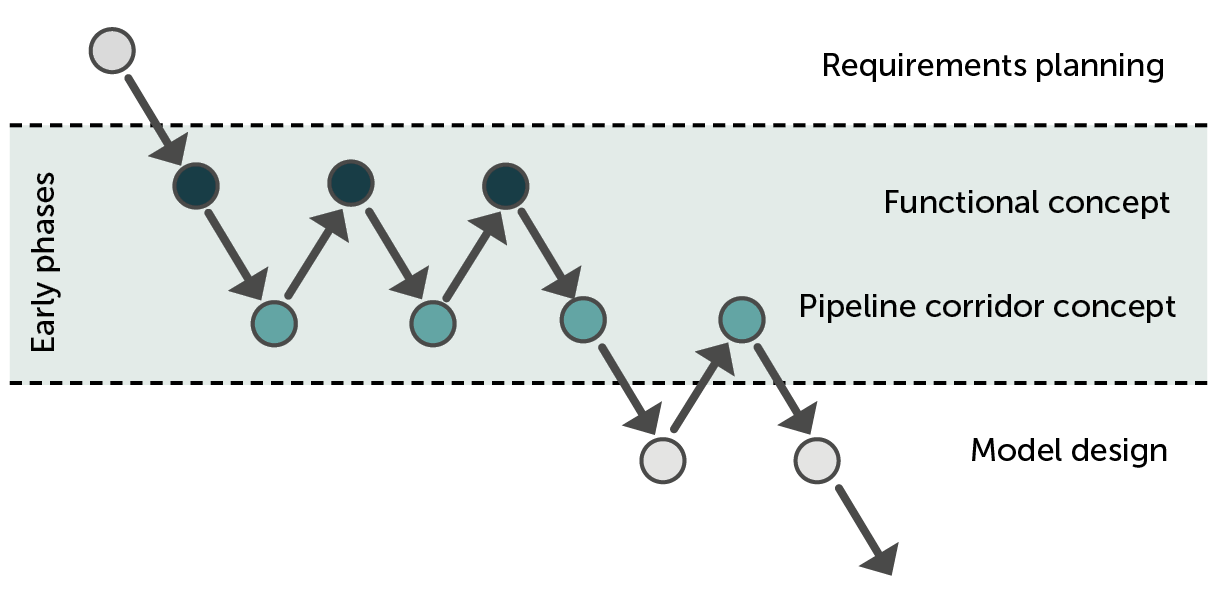 The advantages of a collaborative design approach in early phases become clear when looking at an example of a chronological sequence (cf. Figure 2). The process starts with requirements planning and step by step approaches a first rough concept for the functional-spatial and technical-organizational structure. The number of iterations and considered facility variants can be quite high here, since the conceptual pipeline corridor models are lightweight and flexible compared to conventional three-dimensional design. Only as soon as the rough structural design has been agreed, do the individual trades begin with the further detailing of the model design. For this purpose, too, a pipeline corridor concept is a good starting point for specialized modeling tools. If the information in the model is used consistently and continuously, it is possible to switch to a previous or subsequent step without much effort. For better clarification, Figure 2 shows the individual steps with a brief description and the available information.