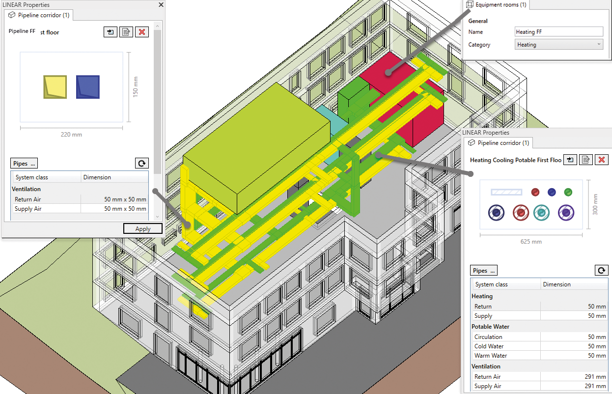 The design approach taken by the LINEAR software in early phases appropriately represents these recommendations in the discipline "pipeline corridor concept". It extends the basic ideas with intelligent information containers for the structural mapping of necessary spaces for different technical media and electrical systems. This simplifies the design and documentation of pipeline corridor cross-sections by using intuitive tools. The given information is also used to support the dimensioning of the necessary information containers and to simplify the transition to detailed design phases. This makes it possible to agree on space requirements at an early stage using lightweight models.