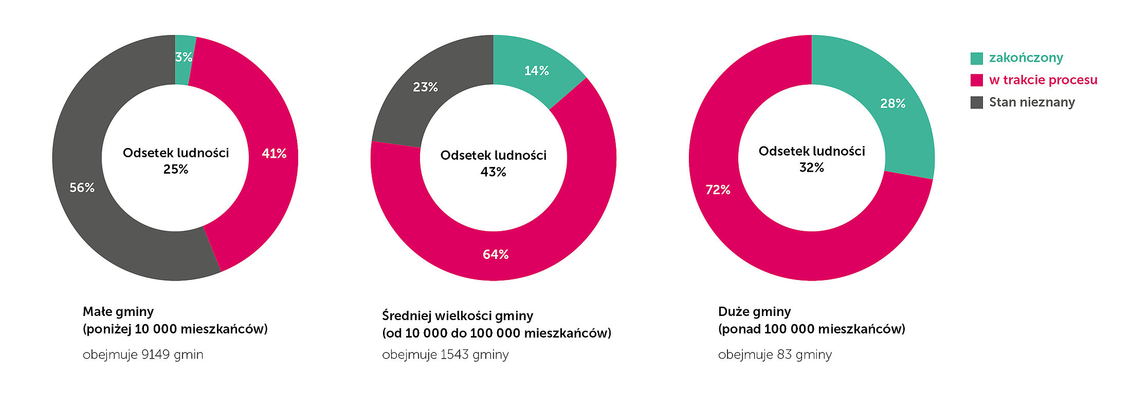 Prawie połowa wszystkich władz lokalnych w Niemczech jest już zaangażowana lub jest w trakcie opracowywania miejskiego planu zaopatrzenia w ciepło (KWP). Ponad 500 władz lokalnych zakończyło już opracowywanie KWP(1). Istnieje wyraźna dysproporcja między dużymi miastami (gminami liczącymi ponad 100 000 mieszkańców) a średnimi i przede wszystkim małymi gminami (wykres 1).