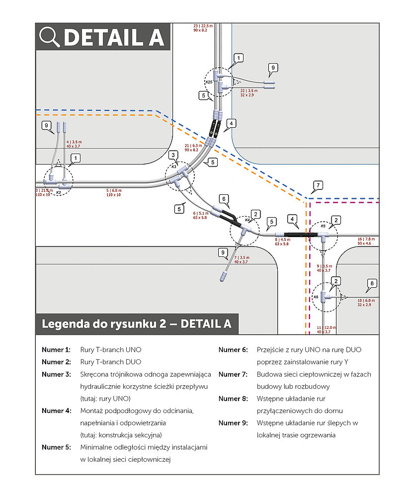Rysunek 1 przedstawia przykładowy projekt sieci ciepłowniczej z uproszczoną reprezentacją sytuacji rozgałęzienia, która jest obecnie bardzo powszechna. Poziom szczegółowości jest ograniczony do podstawowej trasy z odgałęzieniami (węzłami) i przyłączami domowymi. Pod względem wykonalności projekt ten jest jednak nadal niewystarczający. Dla zaznaczonej sekcji sieci "Detal A", Rys. 2 pokazuje, jak, biorąc pod uwagę zastosowanie PMR z odpowiednimi komponentami (w tym przejście z dwóch pojedynczych rur do podwójnej rury za pomocą tak zwanej rury Y), może wyglądać gotowa do wdrożenia reprezentacja. Wydajne oprogramowanie projektowe powinno w przyszłości zbliżyć się jak najbardziej do tego poziomu szczegółowości.
