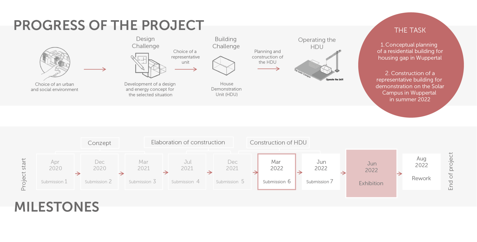 The project started in fall 2019 with the module “Building in Existing Environments” as a semester project at the FH Aachen. At the end of the semester, it was decided to officially submit the project to the Solar Decathlon 2021/22, whereupon the project team was provided with its own office in March 2020 and began further planning. The organization of the tasks and the team itself already took place in the first days. In the following weeks, the structure of the respective topics was deepened. In addition, work processes were analyzed to identify weaknesses, which were subsequently optimized. In mid-March, the team had to move to home office because of COVID-19. From then on, all work processes and communication were carried out via video conferences or telephone calls. Until December 2021, the team worked on the details of the individual competition categories, with 5 mandatory competition submissions that dealt with the different aspects (sustainability, materiality, energy or construction). During this phase, the energy concept was also created using the LINEAR software. From January 2022, the construction phase started in preparation for the exhibition in Wuppertal. During the construction phase, the model was prefabricated in Aachen until it was then dismantled in May 2022, transported to Wuppertal and reassembled on-site by the team.