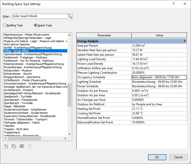 2. Preliminary Planning: Structure of technical model for ventilation and allocation of MEP rooms, i.e., check room type settings -> if necessary, adjust occupancy (area per person) depending on building owner specifications, workplace regulations, etc. (cf. Fig. 4).