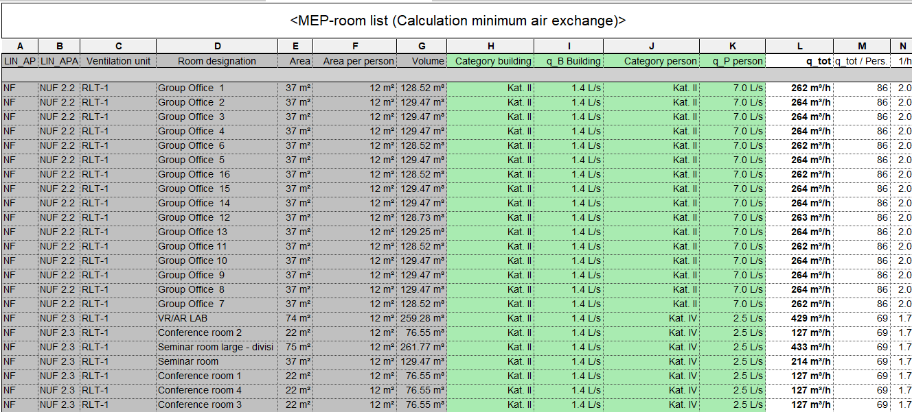 ->Compile demand room book from MEP space list: Determination of demand values according to DIN 16798-1 as sum of occupancy- and room area-dependent volume flows of outdoor air. Excel export to display the results (see Fig. 7).