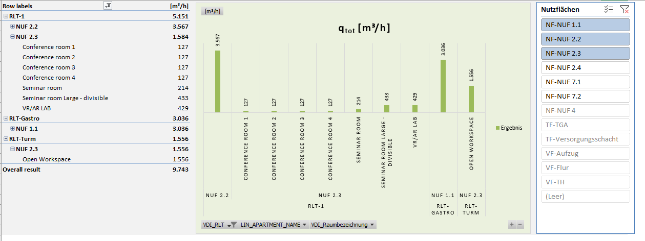 Revit offers limited filtering, sorting and aggregation functions, which are usually quickly exhausted and unsuitable for evaluating larger amounts of data. For a better representation and evaluation through a diagram, the MEP space list can be further processed with the LINEAR export to Excel, e.g. as a pivot table for a variant analysis. In Figure 7, the proportion of air exchange has been evaluated in a slicer based on usable space and system-specific data.