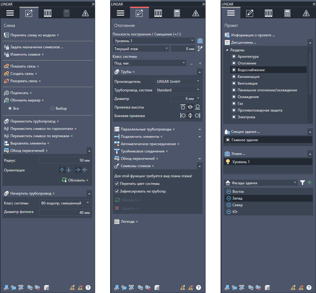 Несмотря на большое количество сходств между нашими решениями для AutoCAD и Revit, есть и различия в наборе функций, например, на панели управления для AutoCAD поддерживается не только проектирование 3D-модели, но и классические методы проектирования, такие как поэтажное, схематичное и эскизное проектирование. Благодаря этим функциональным усовершенствованиям панель управления для AutoCAD в течение времени постоянно расширялась и в конце концов помимо «классического LINEAR Desktop» насчитывала 26(!) ассистентов. Первоначально разработанные для того, чтобы облегчить жизнь новичкам и редким пользователям, впоследствии они стали использоваться для размещения функций, которым больше негде не было места. Теперь перед нами встала задача разработать новую концепцию, которая снова сосредоточит внимание на рабочем процессе, но при этом будет интуитивно понятна и проста в освоении.
