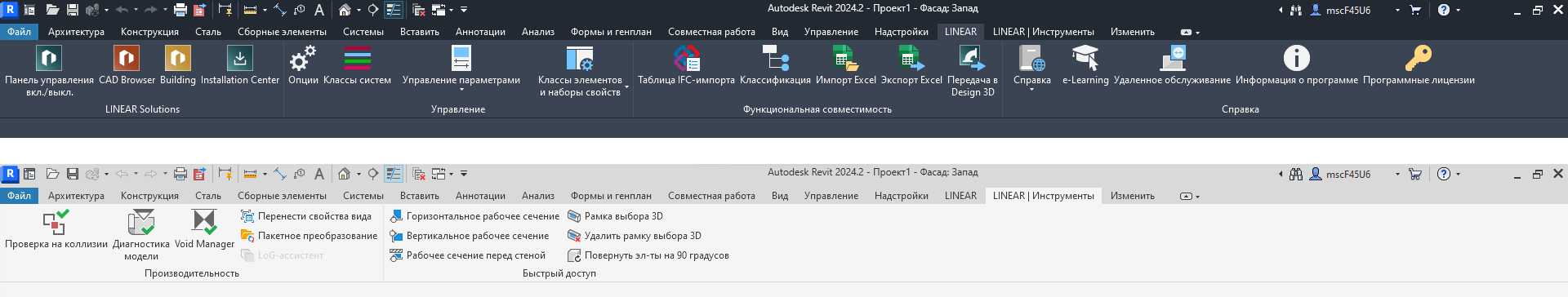 Другим ключевым элементом этой доработки стало добавление нового раздела для проектирования и создания схем в Revit. Этот раздел удалось органично вписать в существующую концепцию интерфейса, чтобы обеспечить отлаженный рабочий процесс (рис. 4). Начиная с версии 24, мы также поддерживаем новый темный режим Revit 24 (рис. 2-4). Как и раньше, главные функции располагаются на вкладке LINEAR. Теперь, чтобы еще лучше организовать структуру и использовать крупные значки, появилась вторая вкладка LINEAR, на которой предлагаются дополнительные инструменты (рис. 5 и 6).