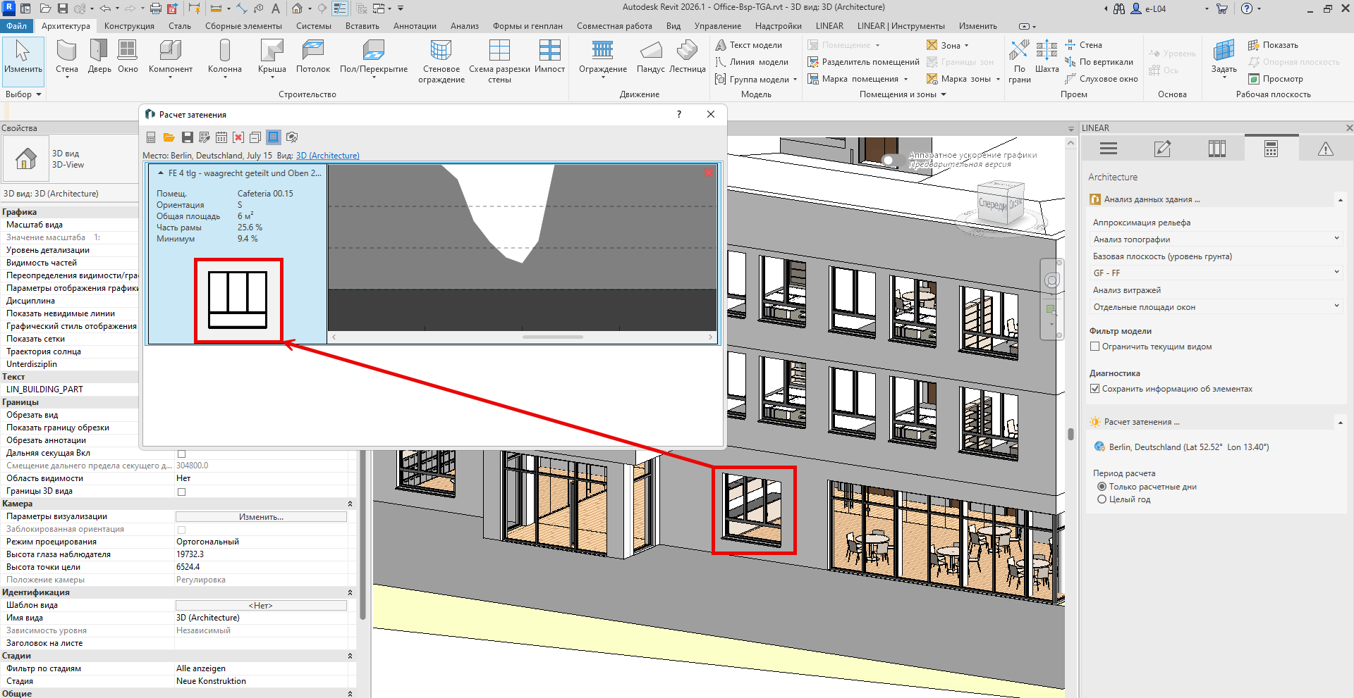 Рассчитанные данные затенения затем включаются в расчет динамической нагрузки на охлаждение. Поступления солнечной энергии через прозрачные компоненты учитываются реалистично — для обоснованного, энергетически оптимизированного проекта.