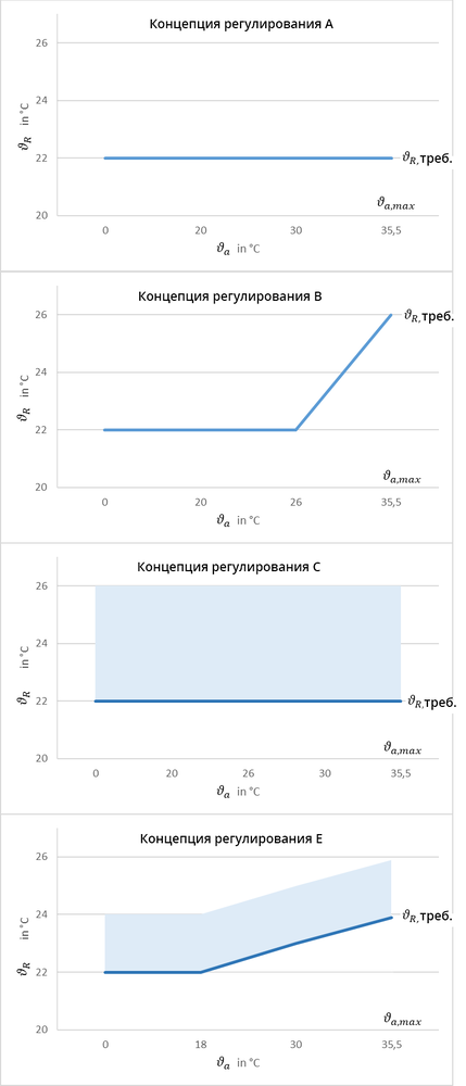 В стандарте VDI 2078 описываются различные концепции регулирования для работы системы охлаждения. Существуют концепции с постоянными температурами помещения или температурами, зависимыми от наружной температуры, а также концепции с диапазоном температур, в котором может использоваться двухточечное или пропорциональное регулирование. Ниже на примере четырех концепций регулирования мы рассмотрим, какое влияние они оказывают на требуемую холодильную мощность и потребность в энергии на охлаждение. Для этого были получены максимальные значения из расчета нагрузки на охлаждение и имитационного моделирования года для углового помещения при работе системы охлаждения 24 часа. На рис. 4 представлены заданные температуры для различных концепций регулирования. Концепция регулирования А предназначена поддерживать постоянную температуру помещения, равную 22 °C. При такой концепции помещение охлаждается, как только температура в помещении начнет повышаться без охлаждения, то есть если в помещение будет поступать больше энергии, чем рассеиваться. Чтобы температура помещения всегда оставалась постоянной, то оно сразу же будет обогреваться, если в него поступает меньше энергии, чем излучается через наружные поверхности. При концепции регулирования B также применяется постоянная температура помещения. Но при этом она связана с наружной температурой. Пока наружная температура не превысит отметку 26 °C, температура помещения при этой концепции также составляет 22 °C. В случае более высоких наружных температур температура помещения линейно увеличивается до 26 ° C. Концепции C и E являются т. н. «двухточечным» регулированием. Такое регулирование задает диапазон температур, в котором температура помещения может изменяться. Для задания диапазона требуется ввести 2 «точки» – минимальную и максимальную температуру помещения. Режим охлаждения запускается, когда температура помещения начинает превышать максимальную. При концепции регулирования C минимальная температура помещения составляет 22 °C, а диапазон температур – 4 K, то есть, помещение начнет охлаждаться начиная с 26 °C. В концепции регулирования E минимальная температура помещения, как в концепции B, привязана к наружной температуре. Но в отличии от вышеописанной концепции, при концепции регулирования E температура помещения начинает повышаться уже с 18 °C наружной температуры. Поскольку максимальная температура помещения также находится на отметке 26 °C, то ее увеличение не настолько значительно, как в концепции B. Результаты расчетов максимальной холодильной мощности показаны на рис. 5, а результаты годовой потребности в холодильной энергии – на рис. 6.
