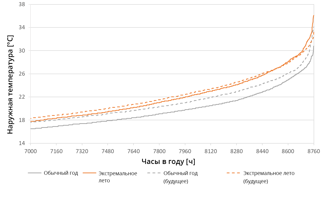 Описанные результаты можно объяснить, если внимательнее присмотреться к температурам TRY. В целях иллюстрации отдельные часы года были отсортированы в порядке возрастания температуры, поэтому хронологического представления нет, но первое значение соответствует самой низкой температуре, а последний час - самому высокому значению температуры соответствующего TRY. На рис. 10 представлены самые теплые часы в году. Максимальные температуры текущего экстремального лета выше, чем в будущем прогнозе, поэтому и нагрузка на охлаждение выше. Однако большую часть времени температура в будущем прогнозе выше, чем в нынешнее экстремальное лето, что приводит к более высокому годовому энергопотреблению для охлаждения. Для будущего нормального года прогноз примерно на 1,5 К выше, чем для текущего нормального года, при этом температурные кривые не пересекаются.