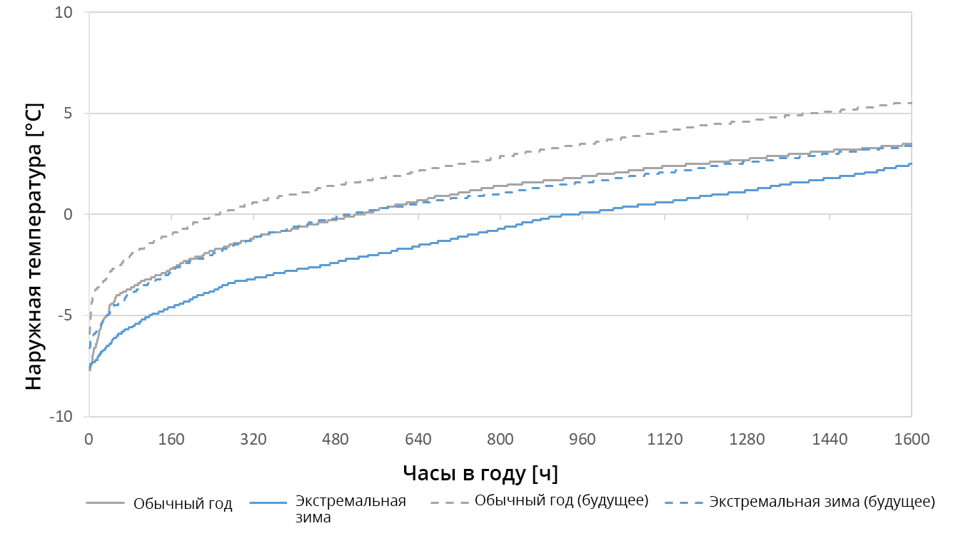Если рассматривать самые низкие температуры в году, то температуры текущего нормального года и будущей экстремальной зимы практически совпадают (см. рис. 11), что также объясняет сопоставимые результаты отопительной нагрузки и потребности в энергии для отопления. Как в будущих прогнозах, так и в текущем TRY самые низкие температуры находятся на одном и том же уровне – около -7 °C. Количество часов с отрицательными температурами наружного воздуха в будущем нормальном году составляет лишь около четверти по сравнению с нынешней экстремальной зимой, насчитывающей около 960 часов. Исходя из сопоставимых самых низких температур наружного воздуха, но больших различий в количестве дней с отрицательными температурами, можно сказать, что различий между максимальной отопительной нагрузкой отдельных TRY меньше, чем между годовым энергопотреблением для обогрева.