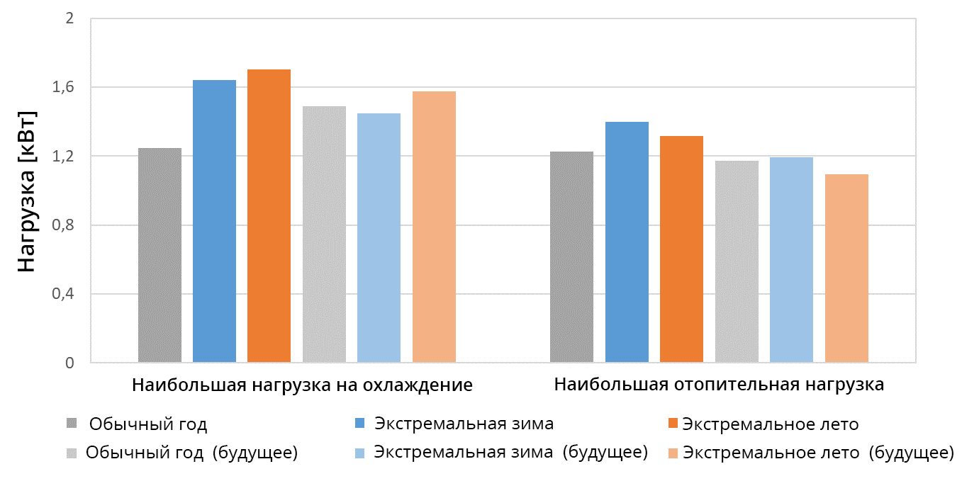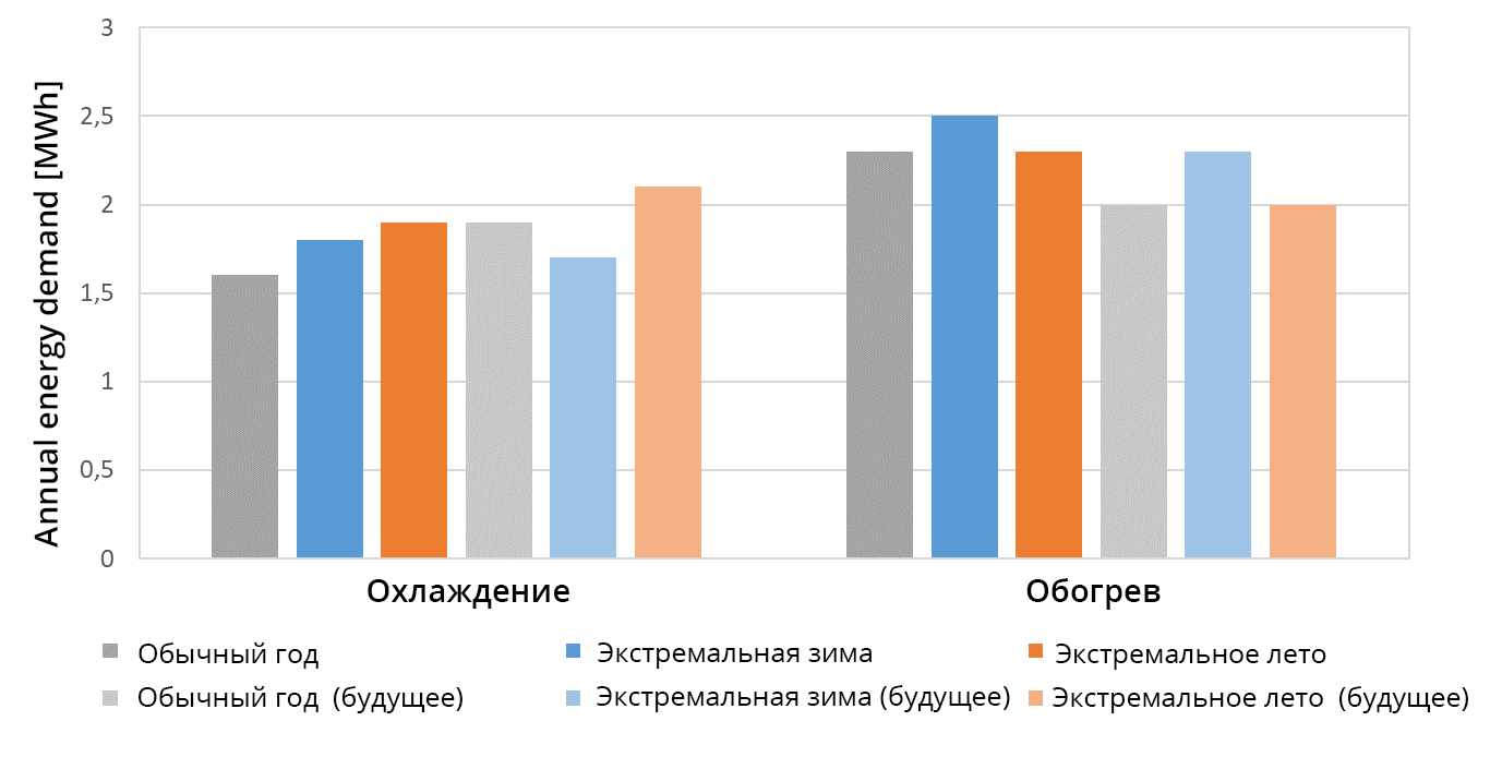 На рис. 8 и 9 показаны нагрузки и годовое энергопотребление для обогрева и охлаждения для шести TRY. Вопреки ожиданиям на первый взгляд, самая высокая нагрузка на охлаждение приходится на текущее экстремальное лето, а не на экстремальное лето будущего прогноза; нагрузка на охлаждение экстремальной зимы также выше, чем нагрузка на охлаждение в обычный год. Однако годовое энергопотребление для охлаждения соответствует ожиданиям, что экстремальное лето требует больше всего энергии для охлаждения. В случае обычного года прогнозируемые значения как нагрузки на охлаждение, так и потребности в энергии для охлаждения увеличиваются по сравнению с текущими. К тому же можно отметить, что отопительная нагрузка и энергопотребление для обогрева в будущем прогнозе ниже, чем в текущем TRY. К тому же интересен тот факт, что текущий обычный год дает результаты, сравнимые с будущей экстремальной зимой.