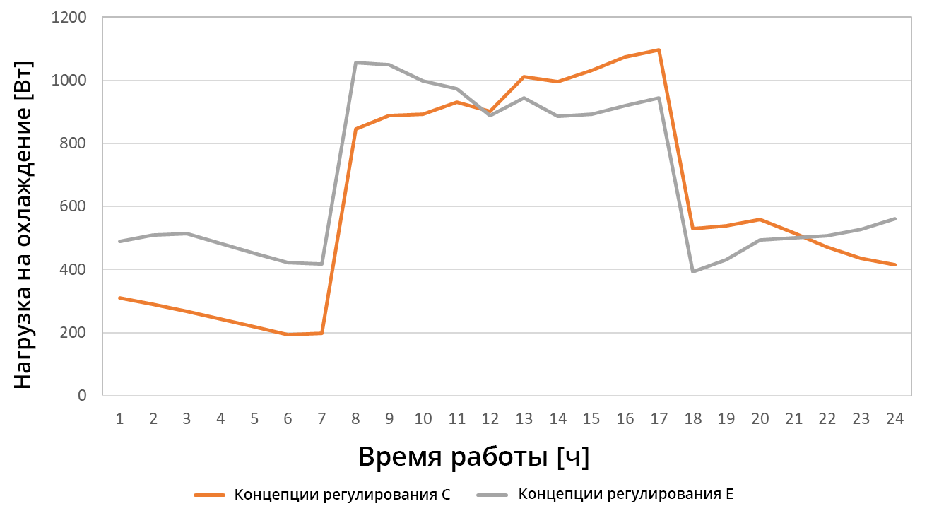 В случае концепции регулирования E («скользящая» температура помещения) максимальная нагрузка выпадает уже на 8 часов утра. В связи с повышением наружной температуры и постоянством внутренней, наибольшая нагрузка на охлаждение достигается во второй половине дня при использовании концепций регулирования с постоянной температурой в помещении, так как наружная температура здесь самая высокая, а стены нагрелись в течение дня. С другой стороны, при концепции регулирования E температура в помещении самая низкая утром, и еще до того, как прямая солнечная радиация достигает помещения (окна с южной и западной стороны), наружная температура повышается, а значит, повышается и заданная температура в помещении. Повышение заданной температуры компенсирует увеличение внесения солнечной энергии в помещение, и нагрузка на охлаждение снижается в течение дня. Тот факт, что максимальная нагрузка на охлаждение при концепции регулирования C с постоянной температурой помещения выше, чем при концепции E, объясняется низкой температурой стен. Из-за низкой заданной температуры в помещении ночью, утром температура стен ниже, чем при концепции регулирования C; это проявляется, прежде всего, в более высокой мощности охлаждения в ночное время. Благодаря более низкой температуре стен, они способны поглощать больше энергии в течение дня и снижать максимальную нагрузку на охлаждение. Более интенсивное охлаждение ночью также объясняет, почему самое низкое годовое энергопотребление наблюдается при концепции регулирования C, так как при ней всегда действует самая высокая заданная температура помещения для режима охлаждения, равная 26 °C.