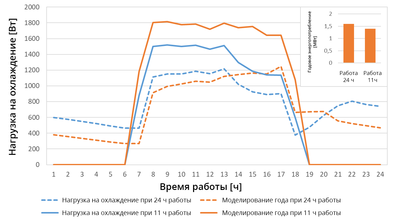 Рассмотрение режимов работы, концепций регулирования и различных типичных эталонных лет показывает различия в результатах и их причины между расчетом нагрузки на охлаждение и имитационным моделированием года. Жаркий период при расчете нагрузки на охлаждение заканчивается одними расчетными сутками, а при моделировании года рассчитывается весь год. Уже по причине различных метеорологических данных рассматриваемых промежутков времени получаются разные результаты. Сравнение рассчитанной нагрузки на охлаждение и наибольшей мощности для охлаждения при моделировании года показывает, что в последнем случае (в нашем примере) получается несколько большая мощность. Однако эти различия незначительны и, за исключением времени работы системы охлаждения «11 часов», по всем параметрам ниже 6 %. Гораздо большее влияние оказал выбор различных режимов работы системы, например, настройки концепции регулирования.