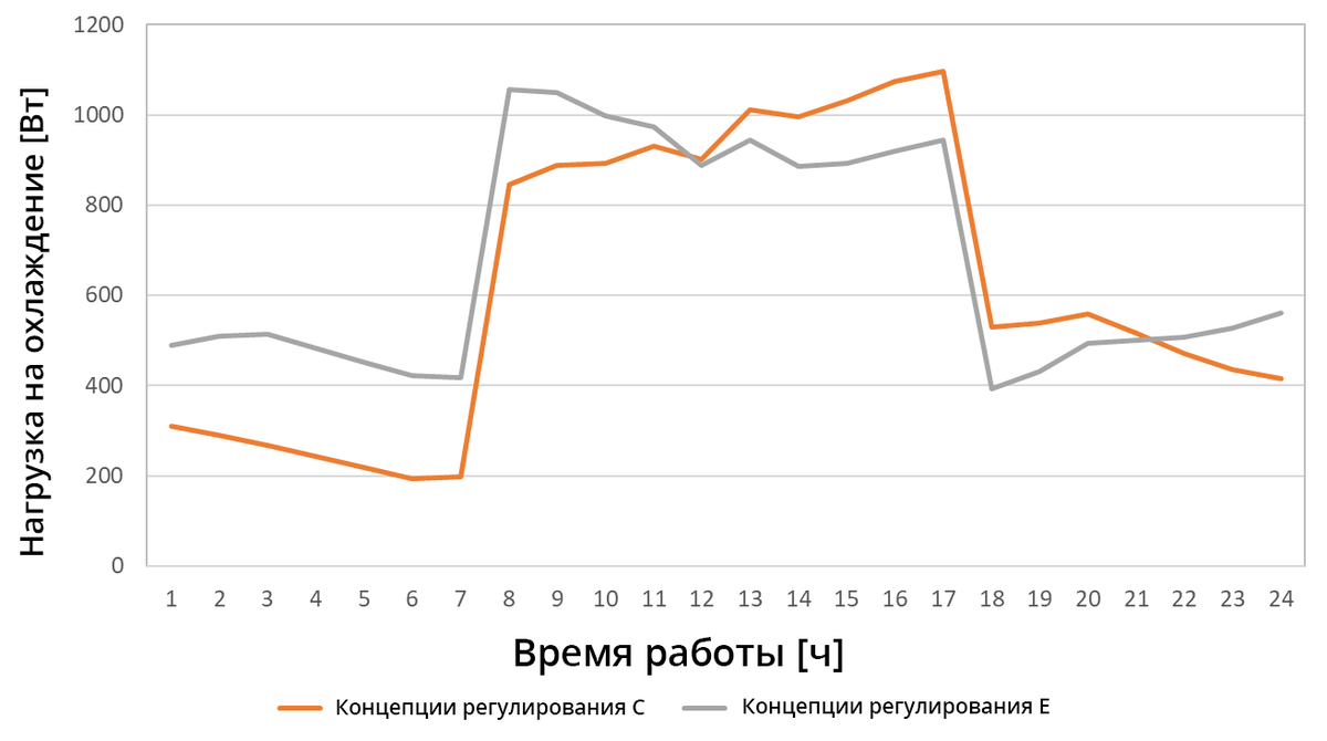 В случае концепции регулирования E («скользящая» температура помещения) максимальная нагрузка выпадает уже на 8 часов утра. В связи с повышением наружной температуры и постоянством внутренней, наибольшая нагрузка на охлаждение достигается во второй половине дня при использовании концепций регулирования с постоянной температурой в помещении, так как наружная температура здесь самая высокая, а стены нагрелись в течение дня. С другой стороны, при концепции регулирования E температура в помещении самая низкая утром, и еще до того, как прямая солнечная радиация достигает помещения (окна с южной и западной стороны), наружная температура повышается, а значит, повышается и заданная температура в помещении. Повышение заданной температуры компенсирует увеличение внесения солнечной энергии в помещение, и нагрузка на охлаждение снижается в течение дня. Тот факт, что максимальная нагрузка на охлаждение при концепции регулирования C с постоянной температурой помещения выше, чем при концепции E, объясняется низкой температурой стен. Из-за низкой заданной температуры в помещении ночью, утром температура стен ниже, чем при концепции регулирования C; это проявляется, прежде всего, в более высокой мощности охлаждения в ночное время. Благодаря более низкой температуре стен, они способны поглощать больше энергии в течение дня и снижать максимальную нагрузку на охлаждение. Более интенсивное охлаждение ночью также объясняет, почему самое низкое годовое энергопотребление наблюдается при концепции регулирования C, так как при ней всегда действует самая высокая заданная температура помещения для режима охлаждения, равная 26 °C.