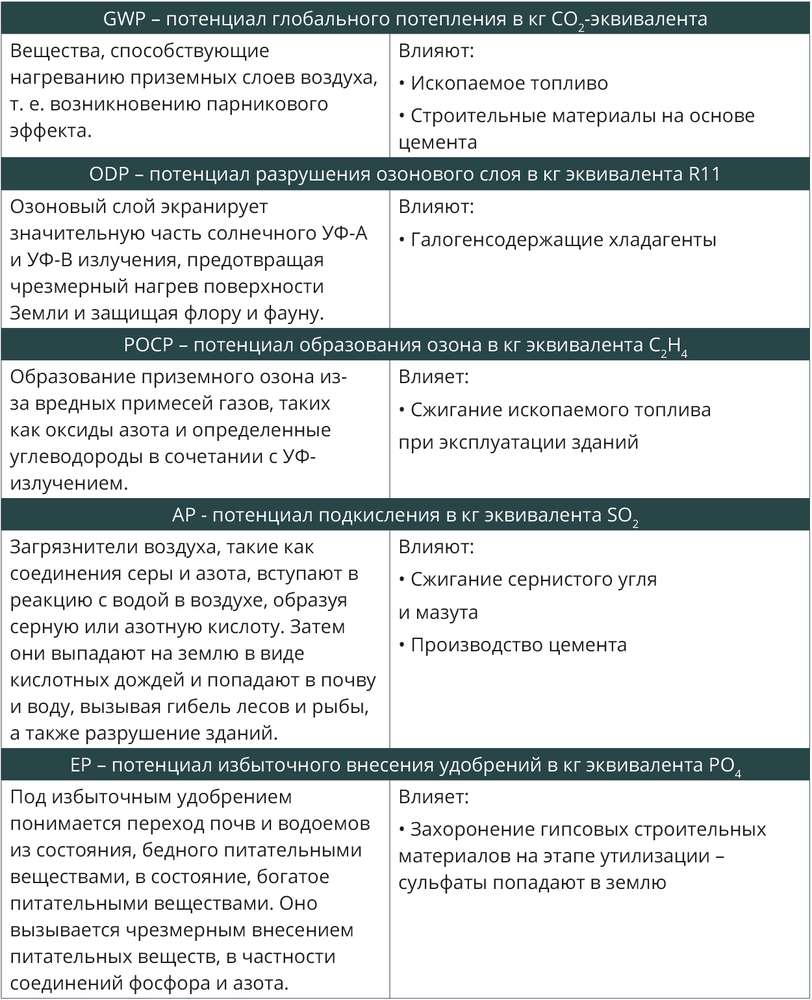 При оценке жизненного цикла здания оцениваются выбросы в окружающую среду. При этом различают глобальное воздействие на окружающую среду и использование ограниченных ресурсов (см. табл. 1 и табл. 2). В этих табличных обзорах дается краткое описание экологических показателей, обычно анализируемых при оценке жизненного цикла, а также их влияния.