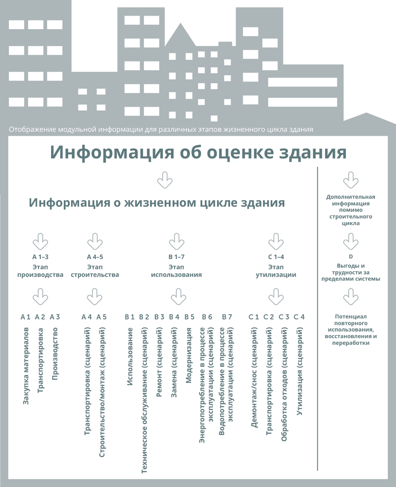 Этапы жизненного цикла здания, которые учитываются при его оценке, регламентированы стандартом DIN EN 15978. Согласно выдержке из этого стандарта, при оценке жизненного цикла учитываются этапы производства (A1 – A3), строительства (A4 – A5), использования (B1– B7), утилизации (C1 – C4), а также потенциал повторного использования, восстановления и переработки (D) (см. рис. 3).