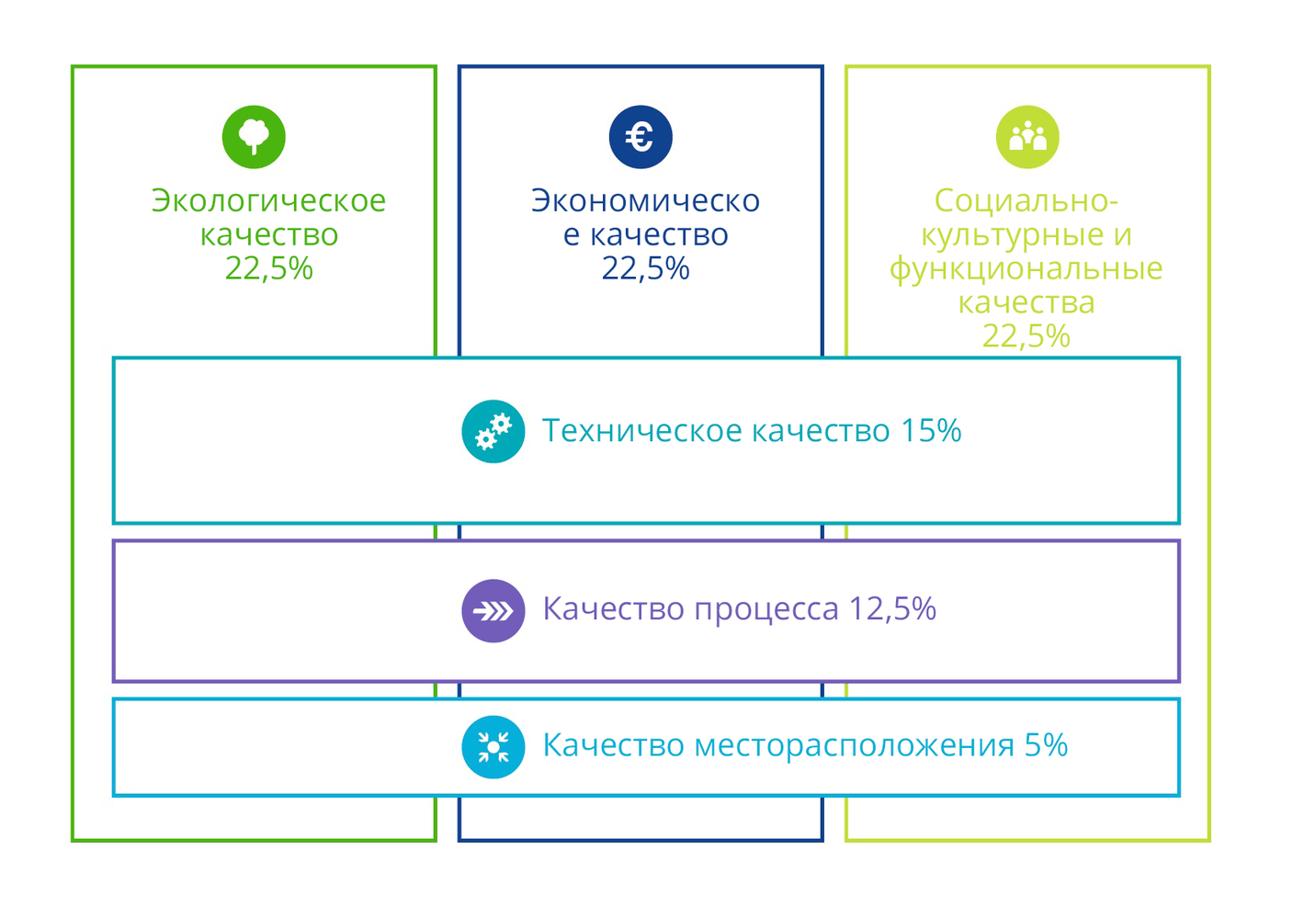 Устойчивое развитие базируется на трех столпах: экологическом, экономическом и социокультурном аспектах. Следующий пример демонстрирует, что эти три аспекта относятся и к устойчивому строительству: экологически чистое здание, которое невозможно продать, потому что оно слишком дорогое, нельзя назвать устойчивым. Равно как и здание, которое стоит недорого, но ни один пользователь не может чувствовать себя в нем комфортно. Крайне важно, чтобы экологические решения способствовали комфорту пользователя, а не уменьшали его. Для того, чтобы здание стало экологически устойчивым, важно принять во внимание еще три других аспекта: процесс проектирования, техническую реализацию и учет местных условий. Все шесть аспектов охватываются системой сертификации DGNB.