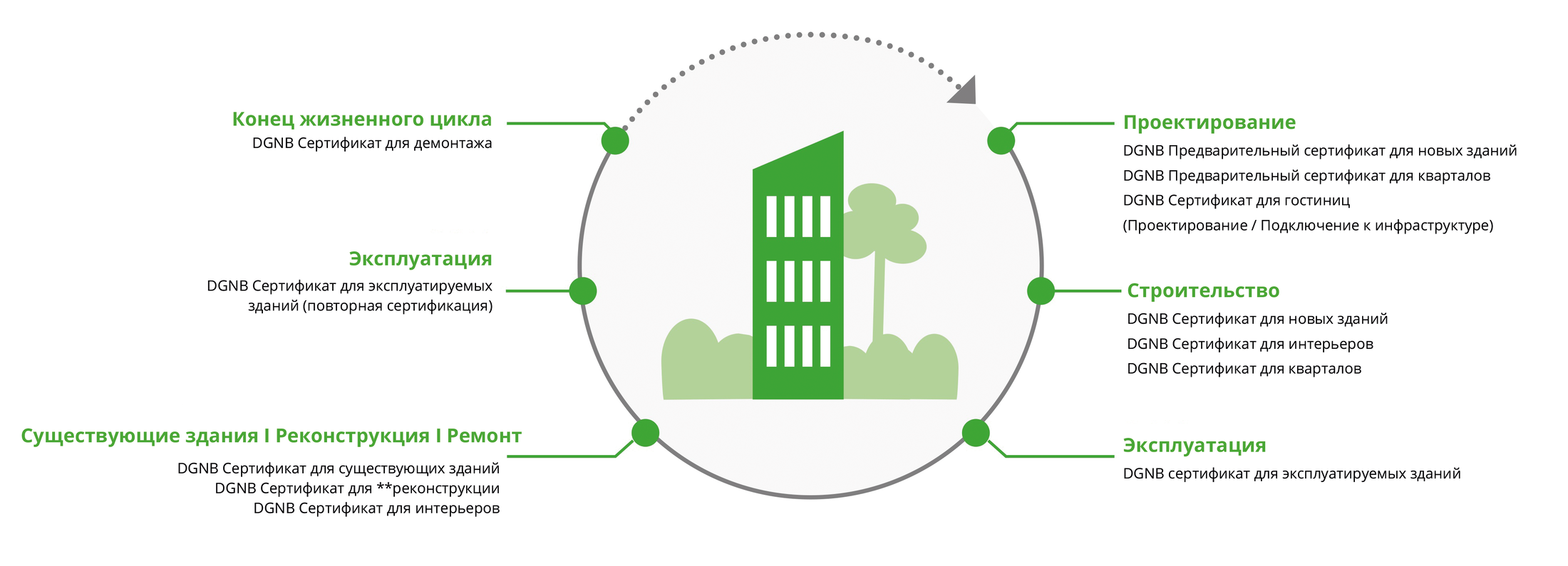 Система сертификации DGNB не сводится только к новому строительству. Она подразумевает большой перечень различных критериев, которые касаются определенных строительных задач, использования и этапов жизненного цикла. Система DGNB для эксплуатируемых зданий, к примеру, помогает методично вывести существующие здания на климатически нейтральный уровень. Система DGNB по демонтажу зданий обеспечивает повторное использование как можно большего количества материалов. Система DGNB для кварталов выделяет целые городские или деловые кварталы. Таким образом, нет ни одного здания, которое нельзя было бы оптимизировать в соответствии с критериями устойчивости. Другими словами: каждое здание может внести положительный вклад в нашу окружающую среду.