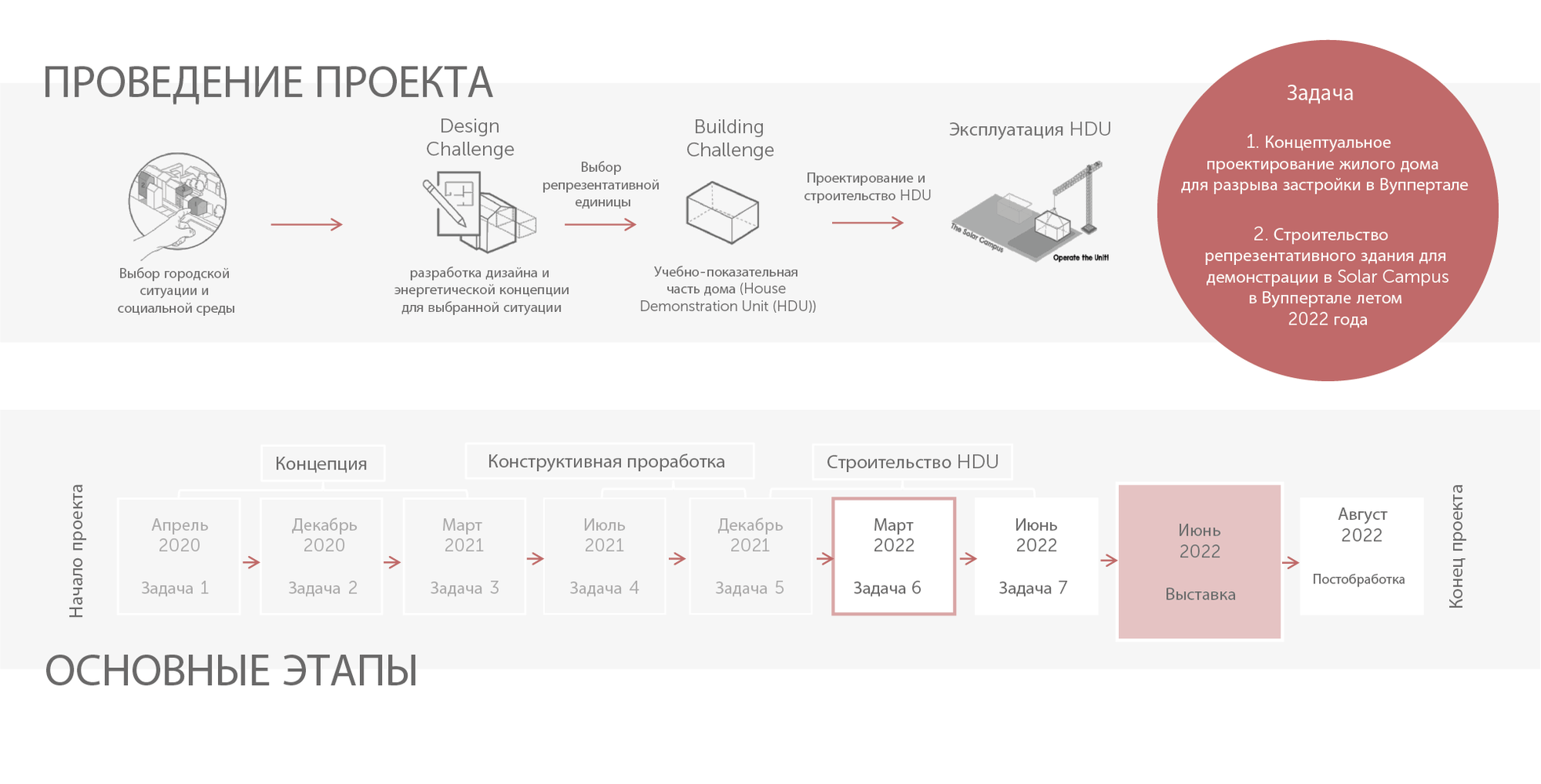 Данный проект начался осенью 2019 года с учебного модуля «Строительство в существующем фонде" как курсовой проект в Университете прикладных наук в Ахене. В конце семестра было принято решение официально представить этот проект на Solar Decathlon 2021/22, после чего в марте 2020 года команда получила собственный офис и проектирование продолжилось. Малые группы участников для выполнения отдельных задач распределились уже в первые дни. В последующие недели потребовалось углубить темы для каждой из групп. Кроме того, были проанализированы рабочие процессы и выявлены слабые места, которые впоследствии удалось оптимизировать. В середине марта команде пришлось работать из дома из-за пандемии COVID-19. С этого момента все рабочие процессы и общение происходили посредством видеоконференций или телефонных звонков. Затем до декабря 2021 года команды подробно работали над отдельными конкурсными категориями: требовалось представить 5 внутренних конкурсных работ, посвященных различным аспектам (устойчивость, используемые материалы, энергоснабжение или конструкция здания). На этом этапе команды снова воспользовались программным обеспечением LINEAR для создания энергетической концепции. С января 2022 года начался этап строительства в рамках подготовки к выставке в Вуппертале. Демонстрационный образец сначала собрали в Ахене, а потом разобрали в мае 2022 года, перевезли в Вупперталь и собрали заново.