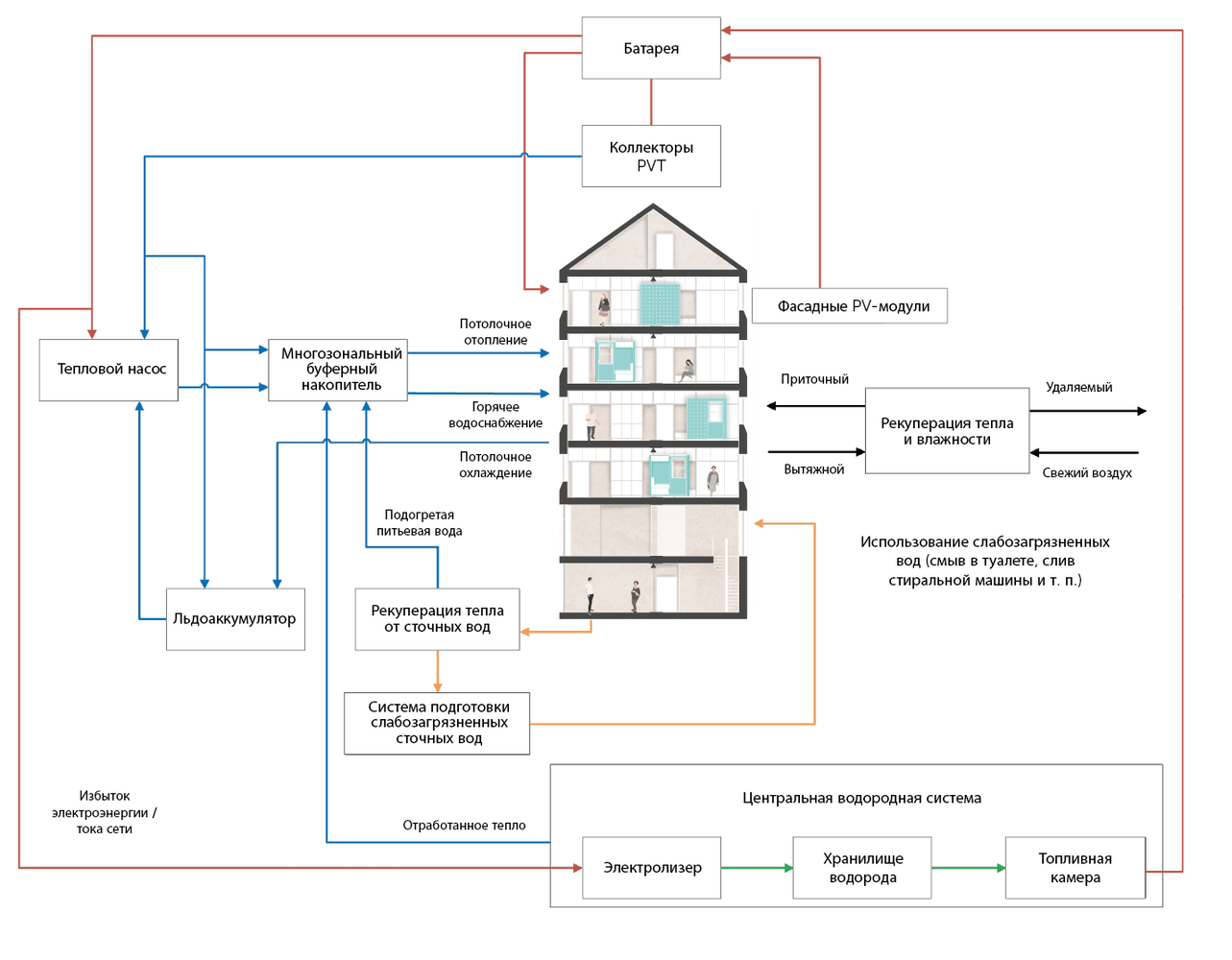 до 65 %. Что касается инженерных систем, то на этапе проектирования учитывались не только индивидуальные особенности здания, но и была разработана инновационная и устойчивая энергетическая концепция с учетом существующего жилого фонда выбранного городского квартала. Еще одним компонентом концепции инженерных систем является подземная установка для льдоаккумулирования, фотоэлектрические тепловые коллекторы (PVT) и тепловой насос с интеллектуальной стратегией управления. В практической реализации от водородной системы отказались из-за недостатка времени для сборки на площадке и кратковременности выставки. Кроме того, был уменьшен размер льдоаккумулятора, поскольку и в этом случае подземная установка была бы нецелесообразна и неосуществима. Помимо этих ситуационных ограничений, система была реализована по плану. Энергетическая концепция новостройки была выглядела следующим образом: